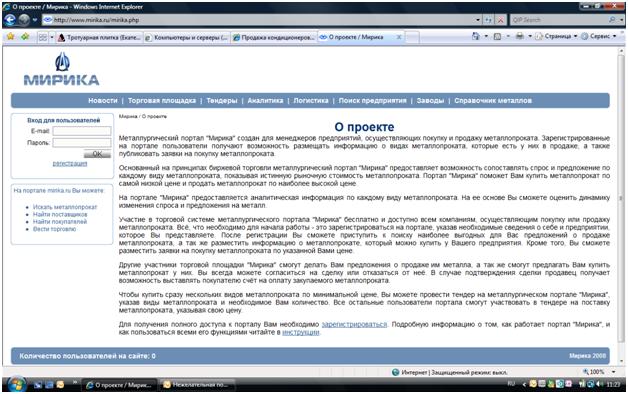 Сайт Металлургический портал "Мирика" http://www.mirika.ru Год создания: 2009 Металлургический портал "Мирика" создан для менеджеров предприятий, осуществляющих покупку и продажу металлопроката. Зарегистрированные на портале пользователи получают возможность размещать информацию о видах металлопроката, которые есть у них в продаже, а также публиковать заявки на покупку металлопроката. В перечень работ по созданию сайта, кроме эскизных вариантов дизайна веб сайта, вошли разработка модуля административного управления сайтом, создание каталога товаров, Новости, Торговая площадка, Тендеры, Аналитика, Логистика, Поиск предприятия, Заводы, Справочник металлов и много чего ещё интересного. Участие в торговой системе металлургического портала "Мирика" бесплатно и доступно всем компаниям, осуществляющим покупку или продажу металлопроката. Всё, что необходимо для начала работы - это зарегистрироваться на портале, указав необходимые сведения о себе и предприятии, которое Вы представляете. После регистрации Вы сможете приступить к поиску наиболее выгодных для Вас предложений о продаже металлопроката, так же разместить информацию о металлопрокате, который можно купить у Вашего предприятия. Кроме того, Вы сможете разместить заявки на покупку металлопроката по указанной Вами цене.